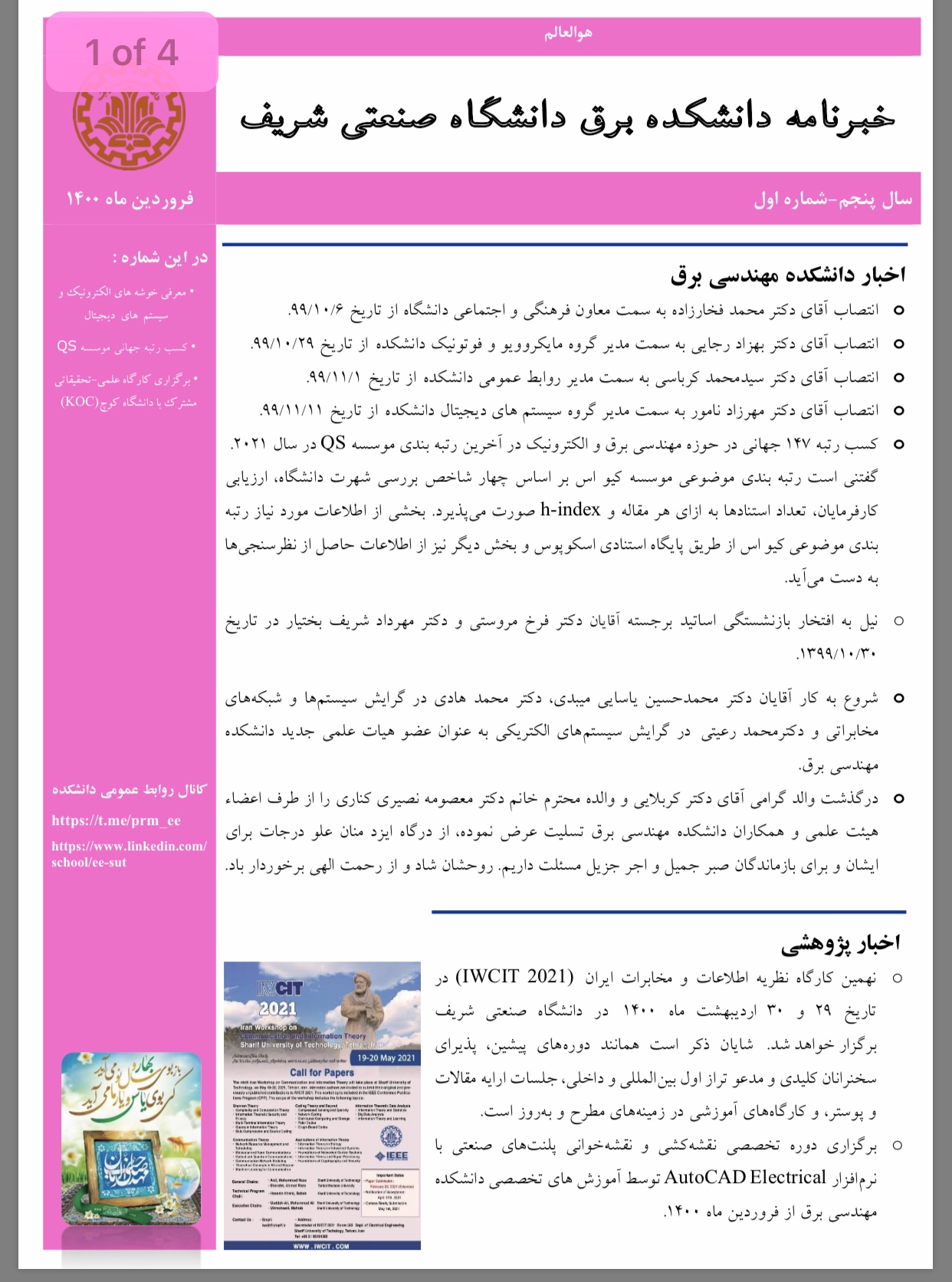 شماره فروردین ماه خبرنامه دانشکده برق دانشگاه صنعتی شریف منتشر شد. علاقه مندان می توانند خبرنامه را از لینک زیر دریافت کنند.