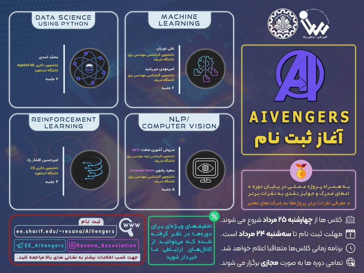 کارگاه هماکنون میتوانید با مراجعه به لینک زیر، نسبت به ثبتنام در هر یک از کارگاهها اقدام کنید. https://ee.sharif.edu/~resana/aivengers • به زودی اطلاعات تکمیلی کارگاهها و برنامه زمانی...