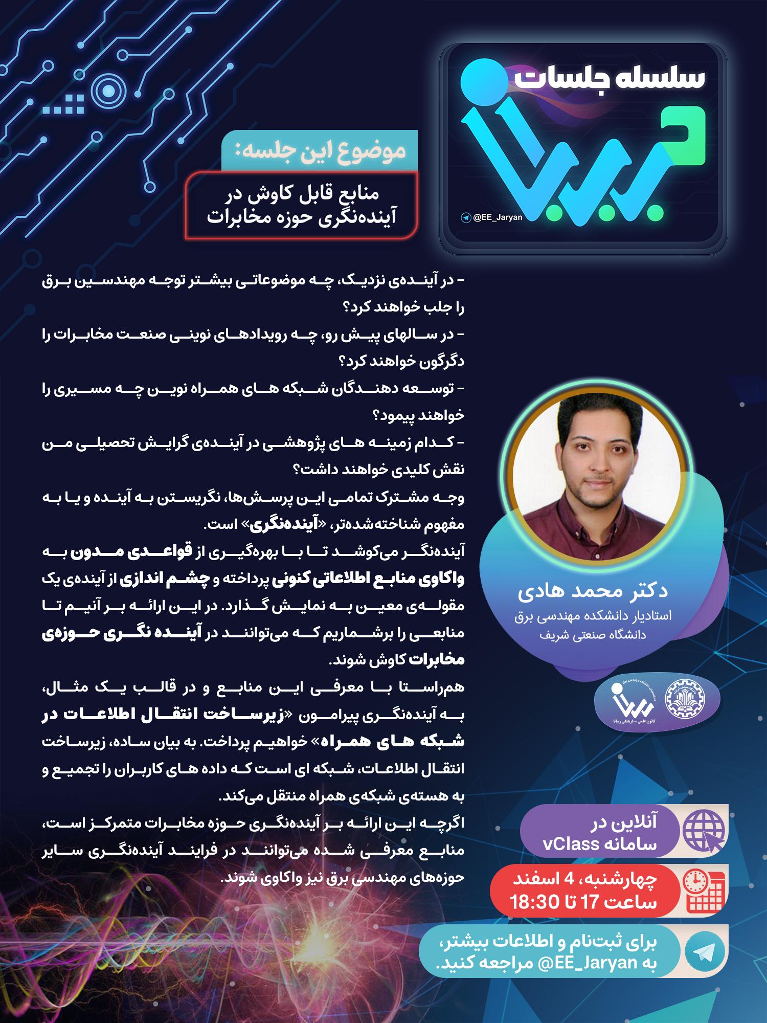 سلسله جلسات جریان منابع قابل کاوش در آینده نگری حوزه مخابرات 1) در آینده نزدیک، چه موضوعاتی بیشتر توجه مهندسین برق را جلب خواهد کرد؟ 2) در سالهای پیش رو، چه رویدادهای نوینی صنعت مخابرات را...