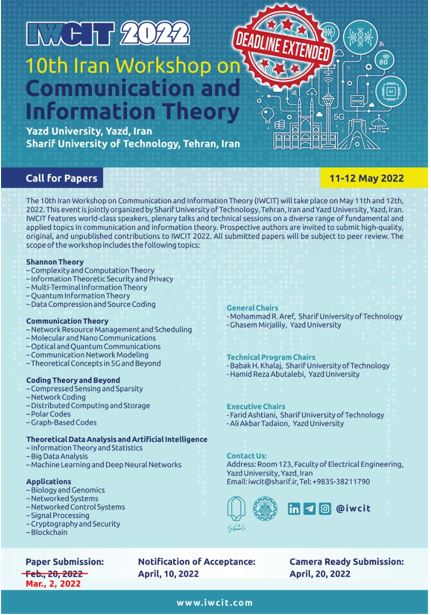 IWCIT 2022 - Call for Papers Deadline Extended May 11-12th 2022 (1401/02/21-22) 10th Iran Workshop on Communication and Information Theory Yazd University & Sharif University of Technology ...