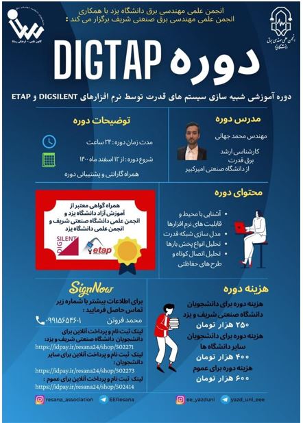 " دوره آموزشی شبیهسازی سیستمهای قدرت توسط نرمافزارهای DIGSILENT و ETAP" انجمن علمی مهندسی برق دانشگاه یزد با همکاری انجمن علمی مهندسی برق دانشگاه صنعتی شریف برگزار میکند: " دوره آموزشی...