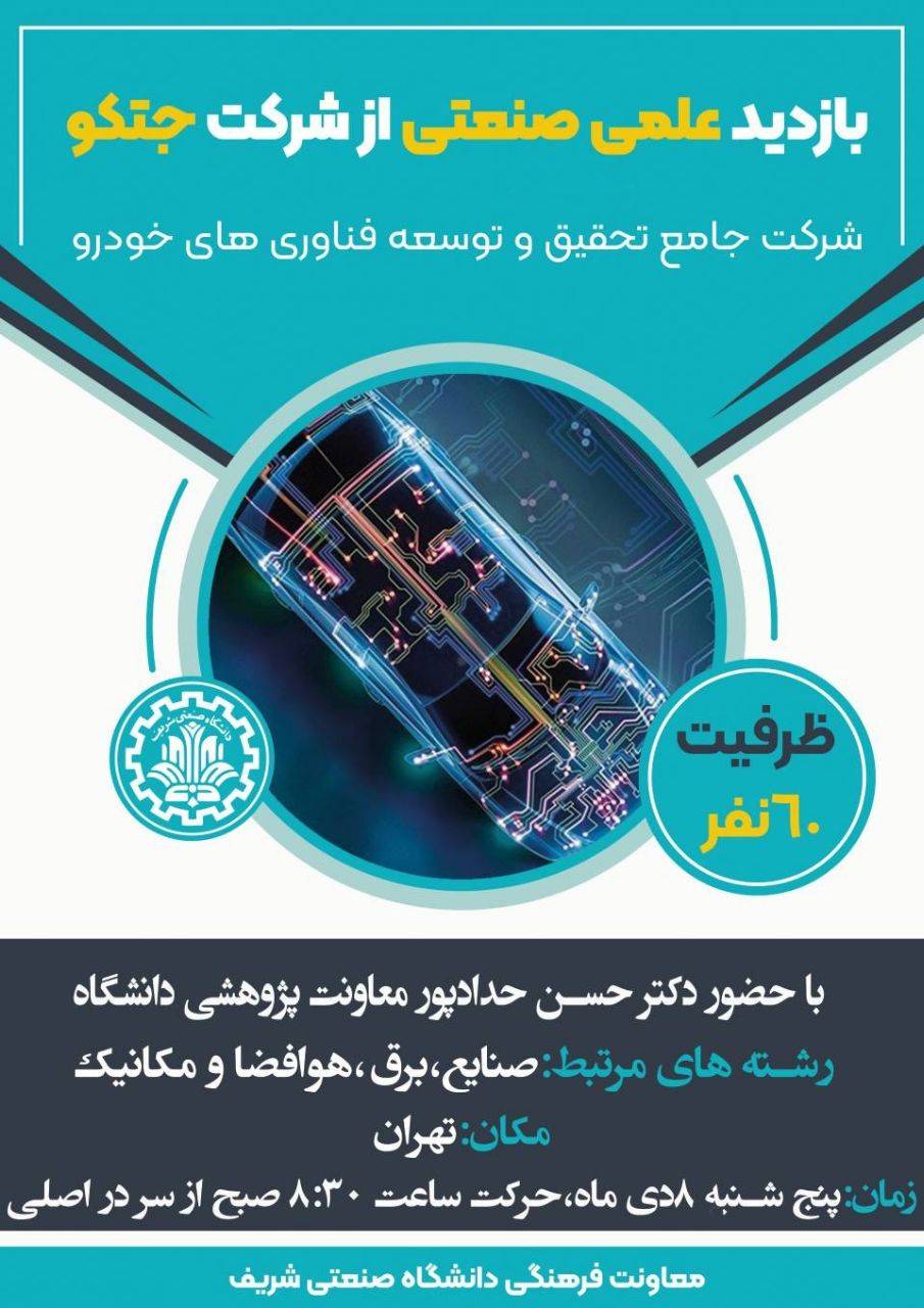بازدید معاونت فرهنگی و اجتماعی دانشگاه صنعتی شریف برگزار مینماید: «بازدید نیم روزه از شرکت جتکو» ویژه دانشجویان ورودی ۱۴۰۱ کارشناسی باحضور دکتر حدادپورمعاونت پژوهشی دانشگاه صنعتی شریف پنجشنبه ۸ دی...