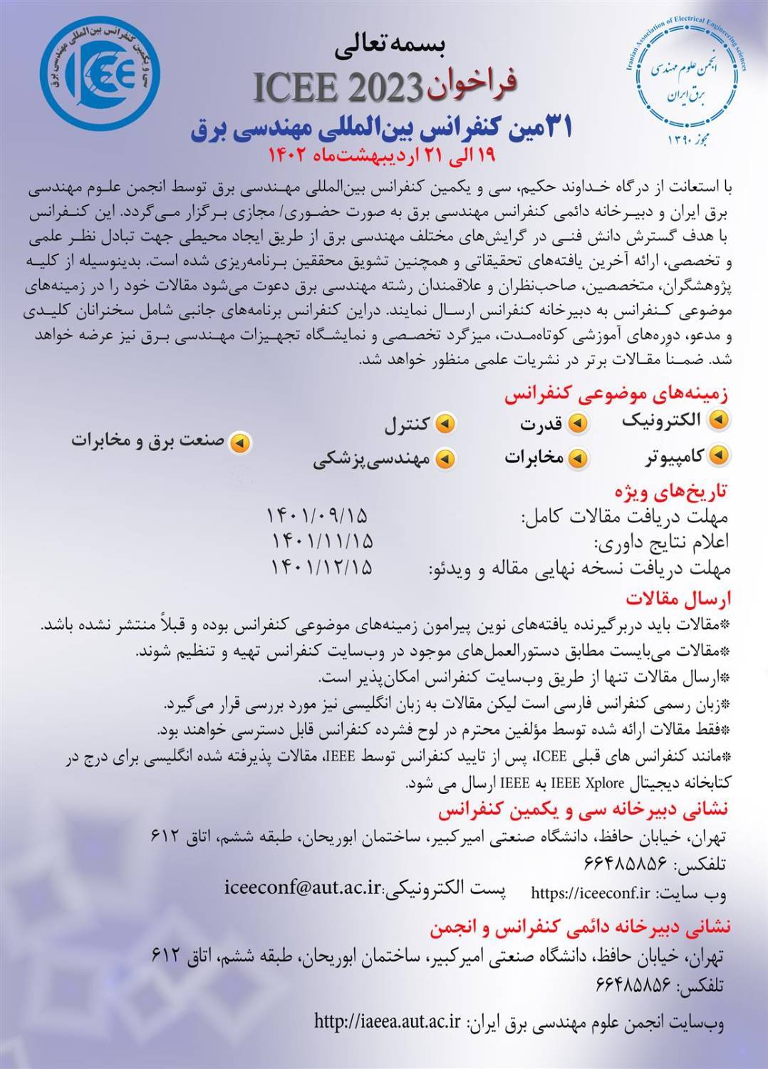 فراخوان ۳۱امین کنفرانس بینالمللی مهندسی برق ICEE 2023 ۱۹ الی ۲۱ اردیبهشت ۱۴۰۲ https://iceeconf.irhttp://iaeea.aut.ac.ir shariifuniversity@