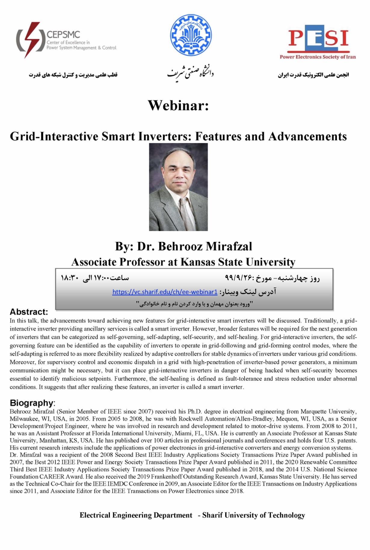 قطب علمی مدیریت و کنترل شبکه های قدرت دانشکده مهندسی برق دانشگاه صنعتی شریف و انجمن علمی الکترونیک قدرت ایران برگزار میکند :