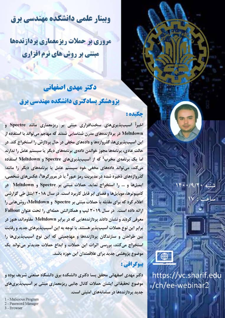 ارائه دکتر مهدی اصفهانی، محقق پسا دکتری با موضوع : مروری بر حملات ریز معماری پردازنده ها مبتنی بر روشهای نرم افزاری شنبه۲۰ آذر ساعت ۱۷