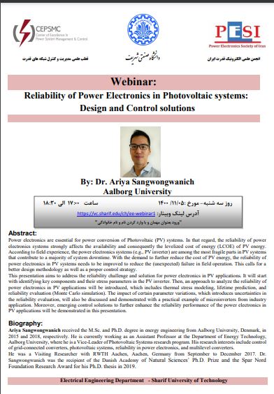 وبینار: روشهایی در طراحی و کنترل برای بهبود قابلیت اطمینان مبدلهای الکترونیک قدرت در سیستمهای فتوولتائیک قطب علمی مدیریت و کنترل شبکه های قدرت دانشکده مهندسی برق دانشگاه صنعتی شریف و انجمن علمی...