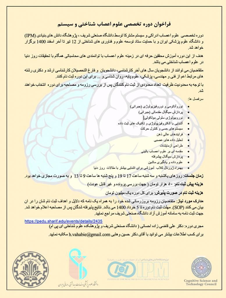 دوره تخصصی علوم اعصاب شناختی و سیستم #فراخوان زمان جلسات: روزهای یکشنبه و سهشنبه ساعت۱۷ تا ۱۹ پنجشنبهها ساعت ۹تا ۱۳ *به صورت مجازی