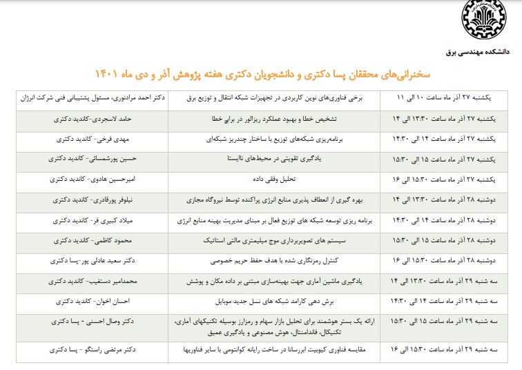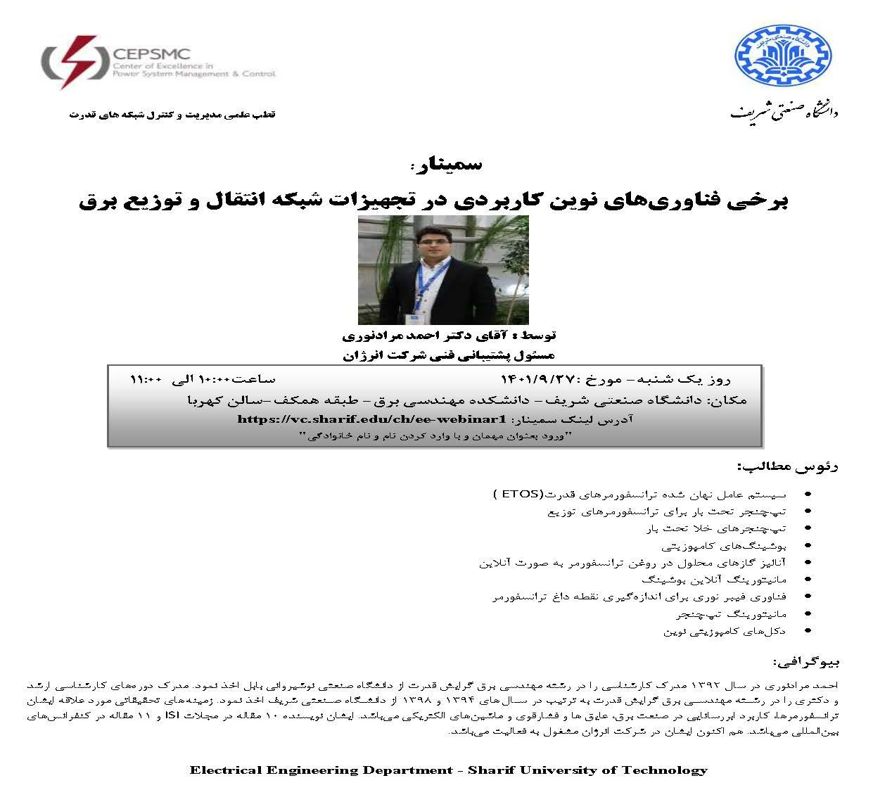 سمینار قطب علمی مدیریت و کنترل شبکه های قدرت دانشکده مهندسی برق دانشگاه صنعتی شریف برگزار می نمایند. سمینار: برخی فناوریهای نوین کاربردی در تجهیزات شبکه انتقال و توزیع برق توسط : آقای دکتر احمد...