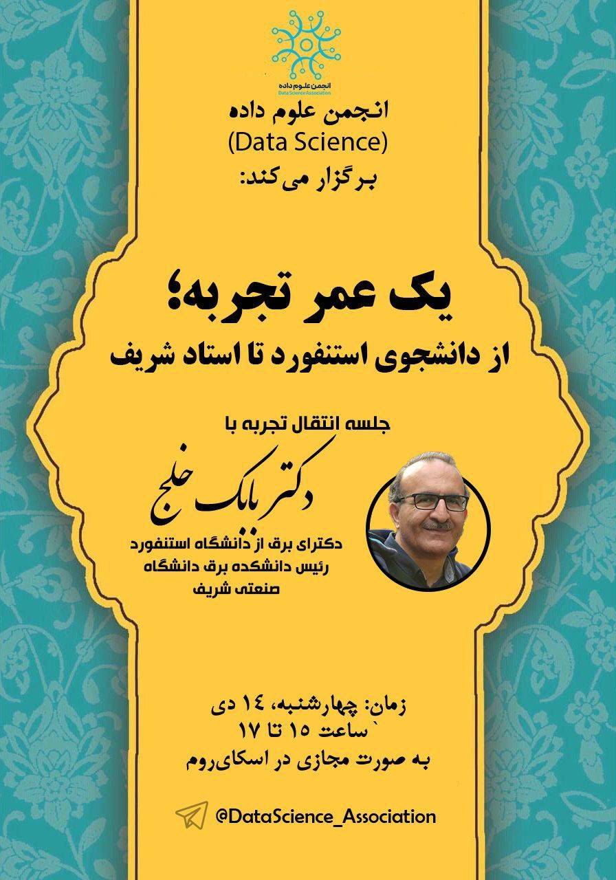 سخنرانی 🔸 یک عمر تجربه؛ از دانشجوی استنفورد تا استاد شریف چهارشنبه ۱۴ دی ماه 🕑 ساعت ۱۵:۰۰ 👤 دکتر بابک خلج 🆔 @DataScience_Association
