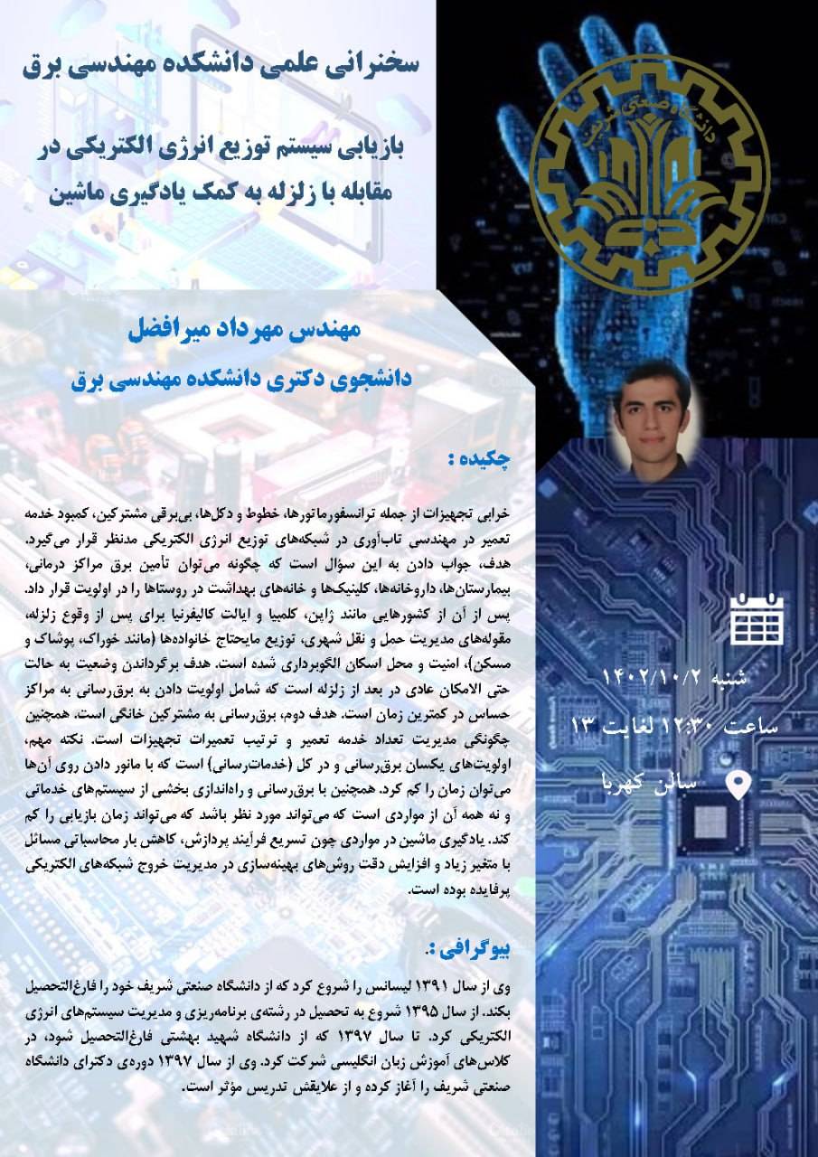 سخنرانی علمی دانشکده مهندسی برق: بازیابی سیستم توزیع انرژي الکتریکی درمقابله با زلزله به کمک یادگیري ماشین