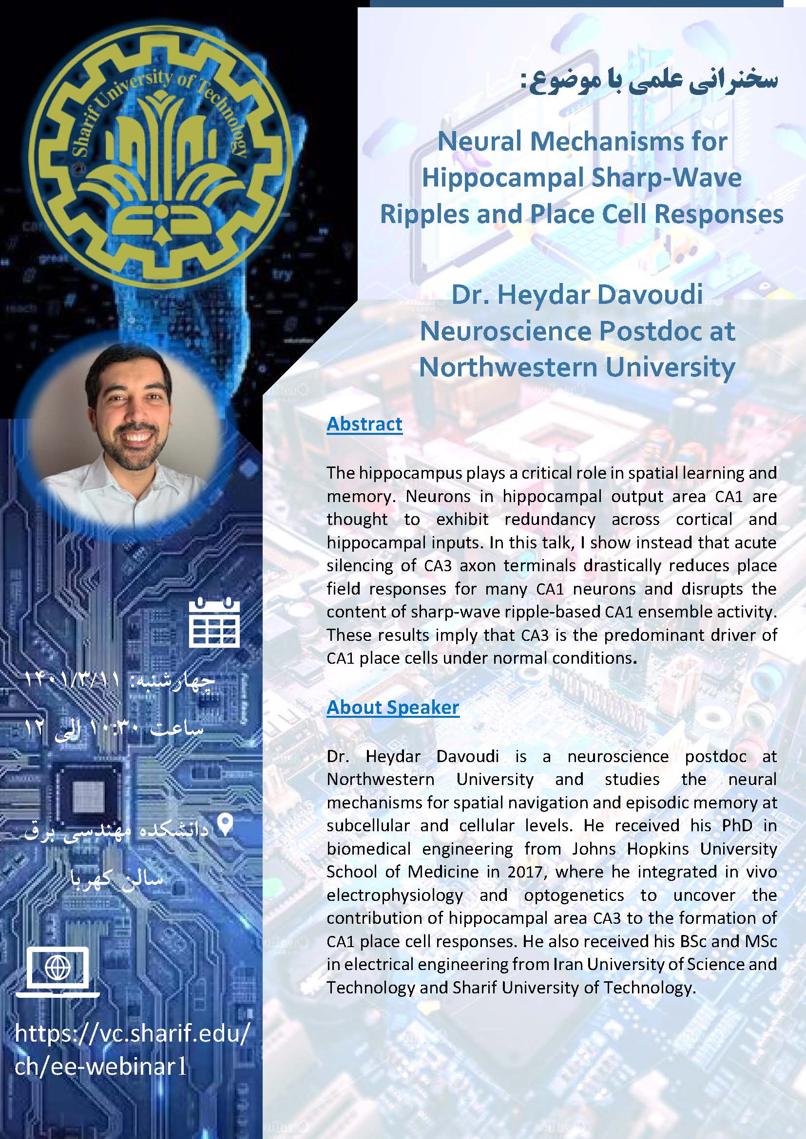 سخنرانی آقای دکتر حیدر داودی (محقق پسا دکتری دانشگاه نورث وسترن) موضوع سخنرانی: Neural Mechanisms for Hippocampal Sharp-Wave Ripples and Place Cell Responses زمان: چهارشنبه 1401/3/11 ساعت: 10:30...
