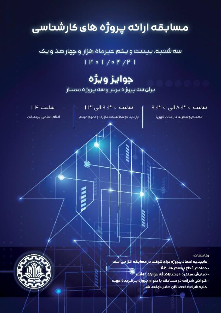 اعلام برگزیدگان مسابقه ارائه پروژههای کارشناسی مسابقه ارائه پروژههای کارشناسی در روز سهشنبه ۲۱ تیرماه ۱۴۰۱ در دانشکده مهندسی برق با حضور ۱۲ داور از اعضای هیات علمی و صنعت به همراه جوایز ویژه با...