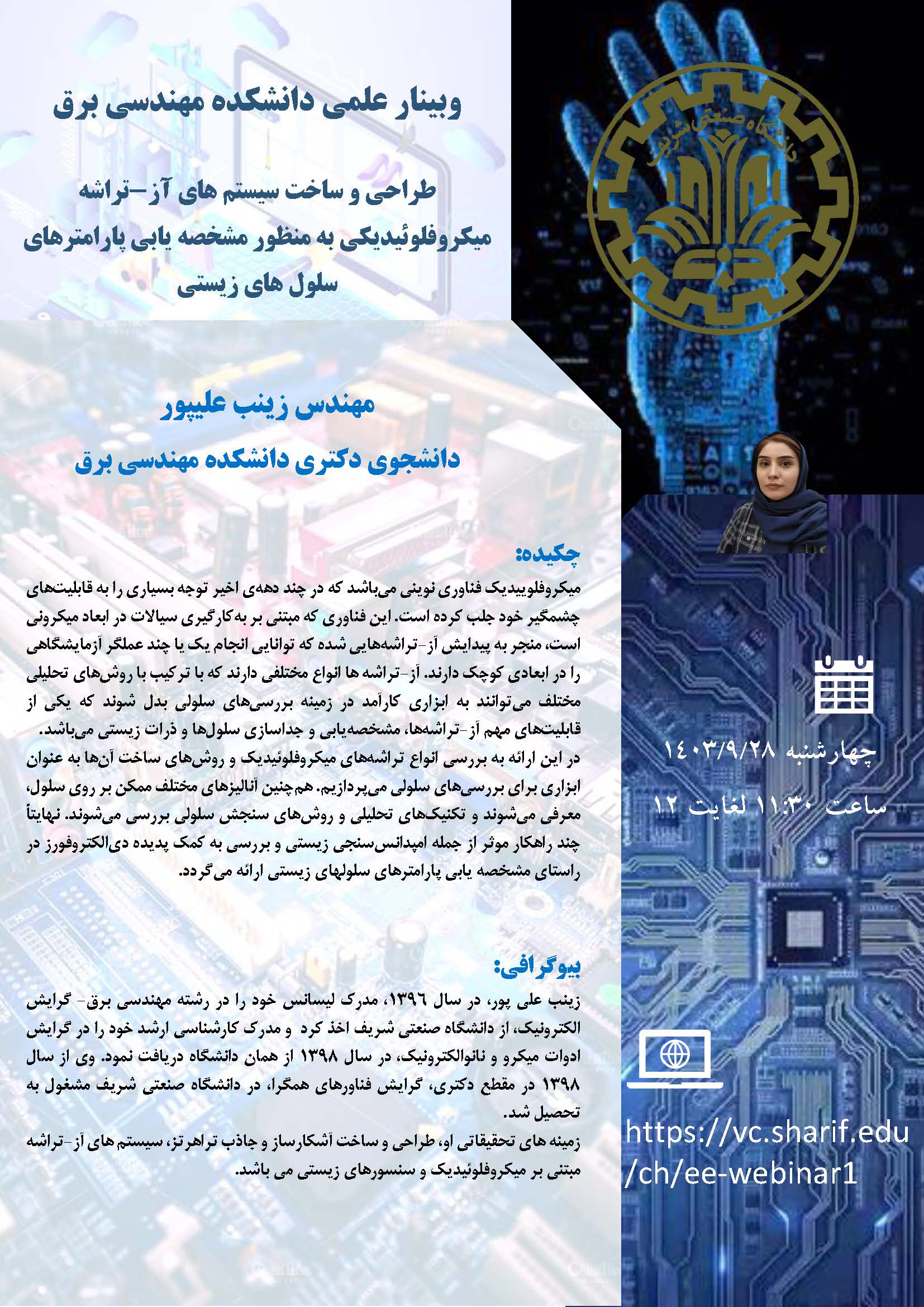 وبینار علمی: " طراحی و ساخت سیستم های آز - تراشه میکروفلوئیدی یکی به منظور مشخصه یابی پارامترهای سلول های زیستی " توسط خانم مهندس زینب علیپور
