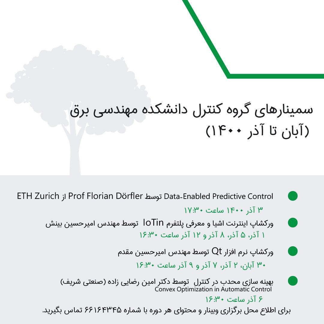سمینارهای گروه کنترل دانشکده مهندسی برق سمینارهای گروه کنترل دانشکده مهندسی برق لینک ثبتنام: https://pedu.sharif.edu/ برای اطلاع از محل برگزاری و محتوای هر دوره با شما زیر تماس بگیرید....