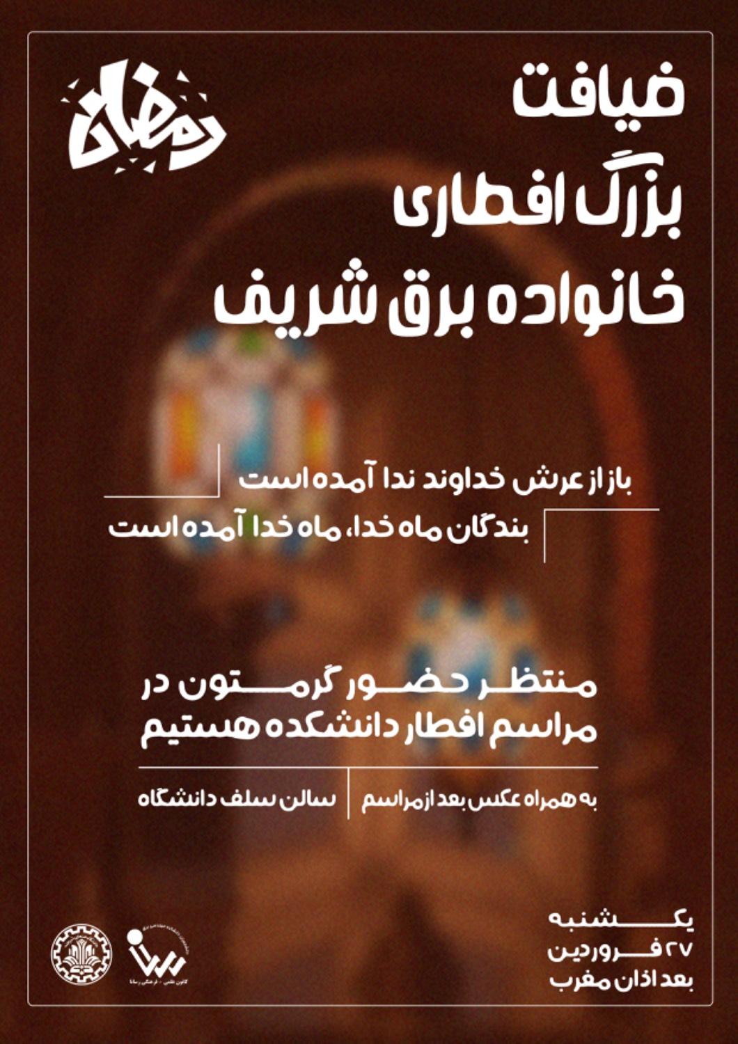 ضیافت بزرگ افطاری خانواده برق شریف ضیافت افطاری با حمایت اساتید محترم دانشکده و پشتیبانی معاونت فرهنگی دانشگاه و همت انجمن علمی رسانا برگزار می شود منتظر حضور گرمتان در مراسم افطار دانشکده هستیم...