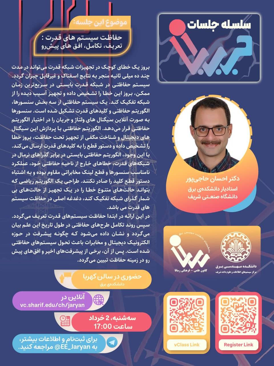 سلسله جلسات جریان سلسله جلسات جریان برگزار میکند: دکتر احسان حاجیپور استادیار دانشکدهی برق دانشگاه صنعتی شریف حفاظت سیستم های قدرت: تعریف، تکامل، افق های پیش رو جلسه به دو صورت حضوری و مجازی...