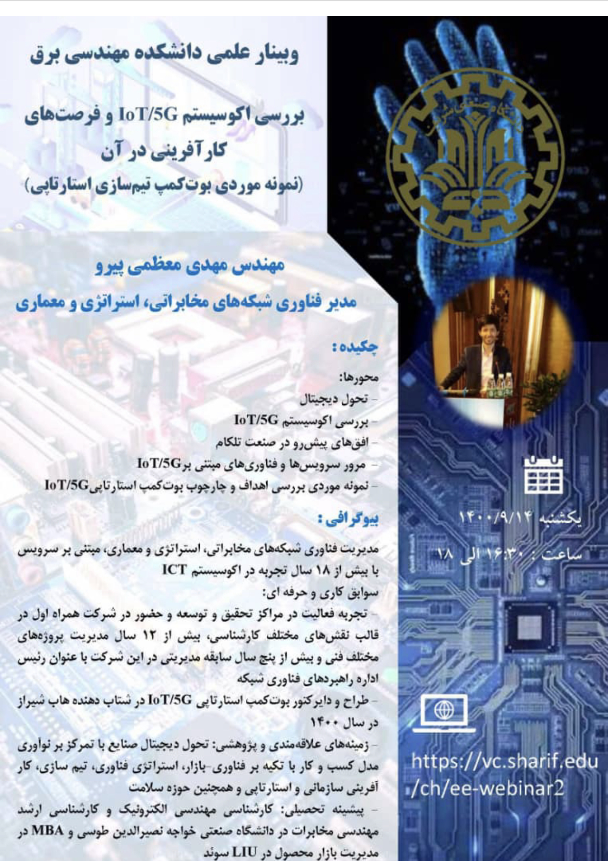 سخنرانی مهندس معظمی پیرو مدیر فناوری شبکههای مخابراتی، استراتژی و معماری با موضوع : بررسی اکوسیستم ۵G/IOT و فرصت های کارآفرینی در آن -نمونه موردی بوت کمپ تیم سازی استارتاپی