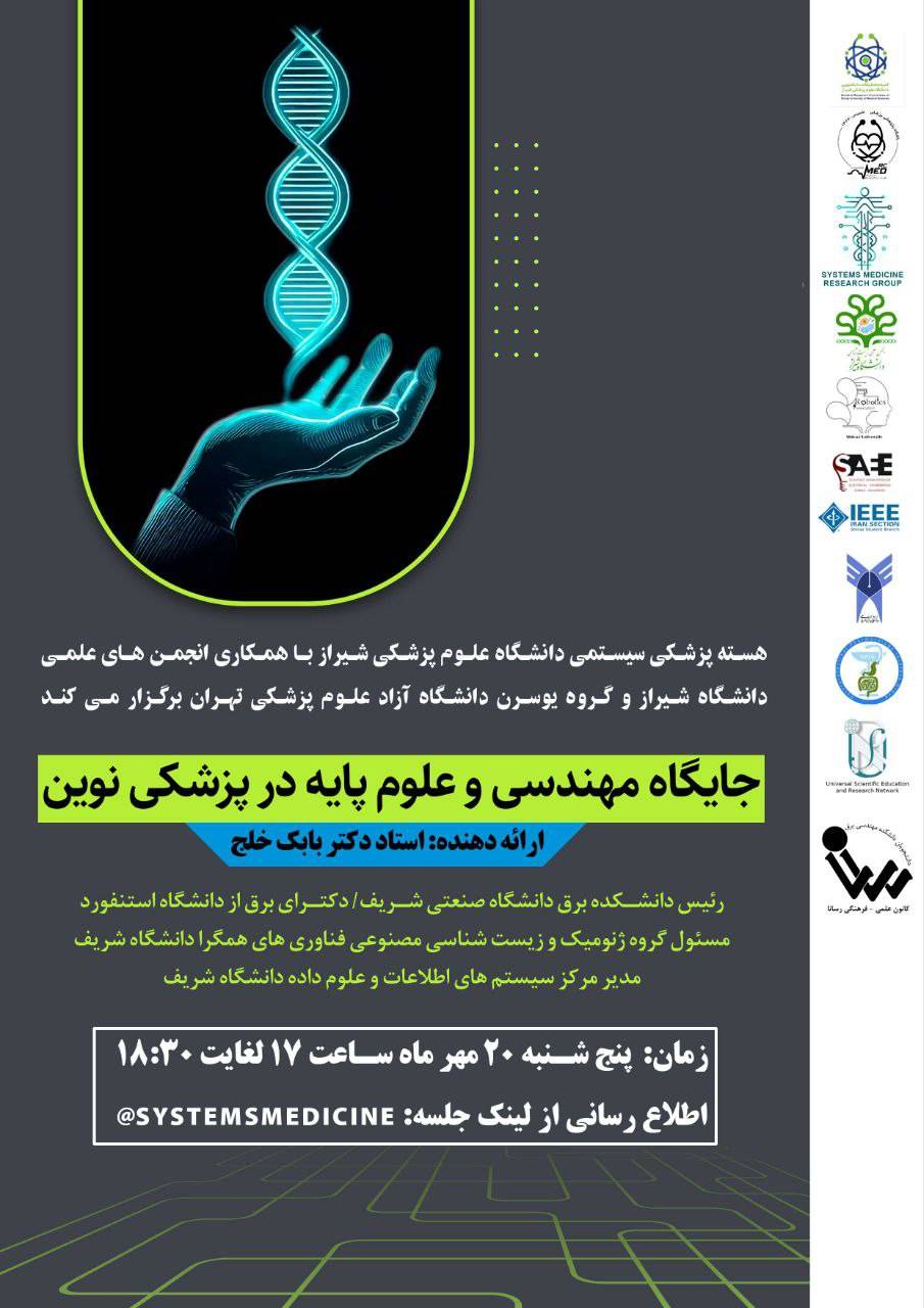 وبینار: جایگاه مهندسی و علوم پایه در پزشکی نوین وبینار تحت عنوان: " جایگاه مهندسی و علوم پایه در پزشکی نوین" توسط جناب آقای دکتر بابک خلج ، 20 مهرماه 1402 برگزار شد.